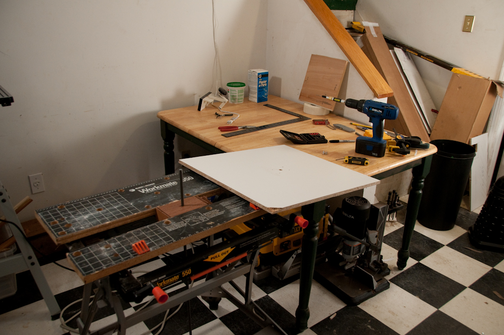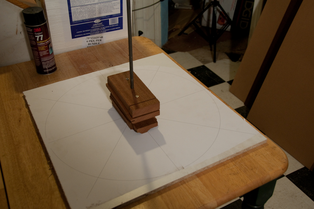 Next we mount the block at the center of the board we are going to use as a base. The base has a hole drilled through the center so that I can knock out the rod from underneath when I am done with it.