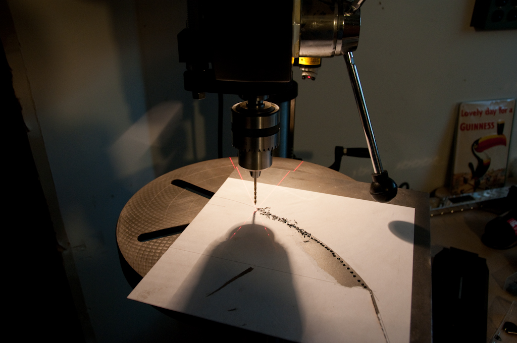 Now we make the former from a metal plate. Cutting this on the bandsaw would have been easier but I didn't have the right blade at the time and so it was the 'drill lot of holes' method. Again, I have glued a template made on the plotter to the work piece.
