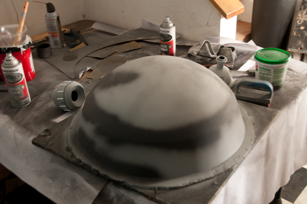 Spray filler done, the dome gets a coat of duratex. This was a mistake because it undid all the work I had one to get a perfect surface. In theory the duratex should have allowed the plug to demould perfectly but that didn't happen either.