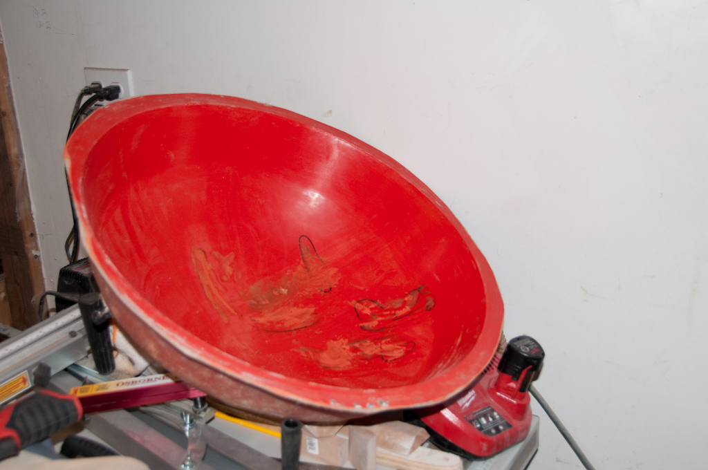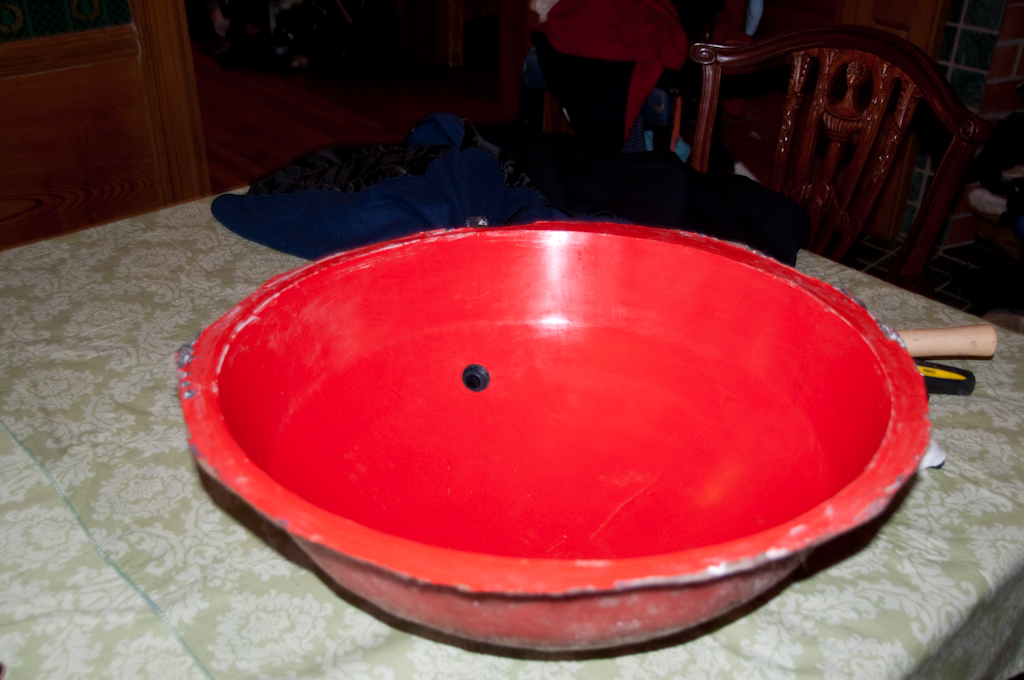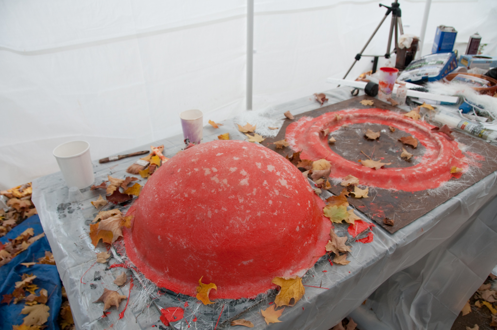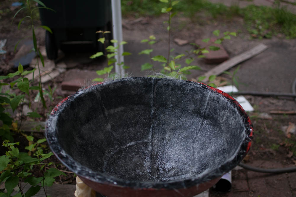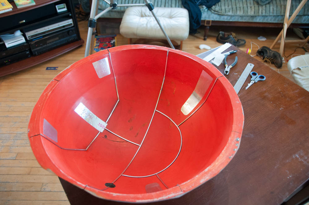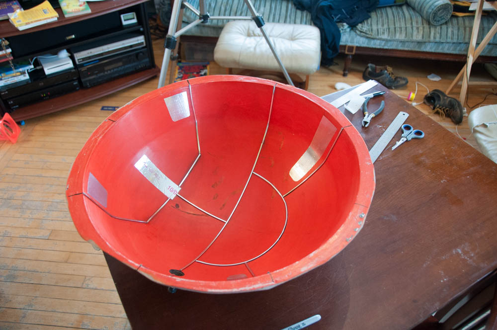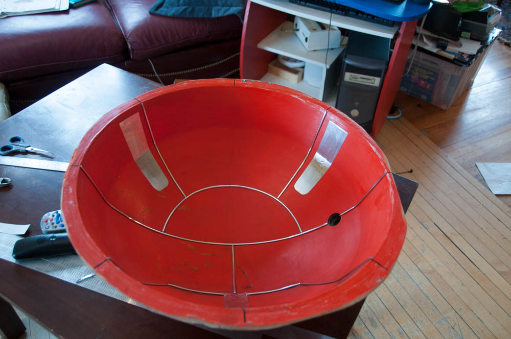 My first attempt at making the dome was a failure. A change in the weather caused me to suspend outdoor dalek building over the winter. For whatever reason, large chunks of the gel coat separated from the matting. This wasn't the only part I had problems with but after trying to fix up the dome groves and failing, I decided it was easier to try again.