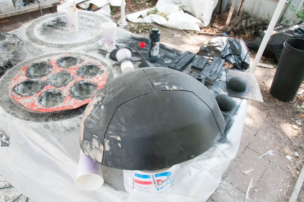 The actual mold making process is the same as for any other part of the fiberglass work: a gel coat followed by layers of epoxy and glass mat. Here is the dome and one of the neck rings getting their fiberglass. Note the white areas in the mat, those are areas where the air bubbles I will come to next crept in. Should have spent more time flattening them with the roller!